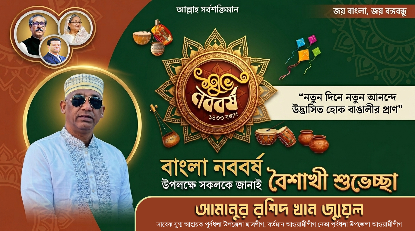 বাংলা নববর্ষ উপলক্ষে পূর্বধলা উপজেলা নেত্রকোনা ৫, সংসদীয় আসন ১৬১ এর সর্বস্তরের জনগনকে শুভেচ্ছা জানিয়েছেন। আওয়ামীলীগ নেতা, বিশিষ্ট সমাজ সেবক আমানুর রশিদ খান জুয়েল